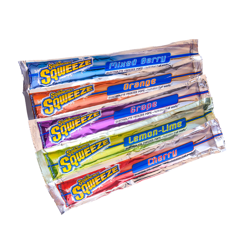 The great taste and performance of Sqwincher, available in a tasty frozen treat. Reduce core body temperature with Sqwincher's scientifically developed formulation that is absorbed into the body at a significantly faster rate than water, allowing the body to replenish the electrolytes and minerals needed for proper rehydration. Assorted flavors: cherry, grape, orange, mixed berry and lemon-lime. 150/case. Bulk packed in an unbranded box with one bag of 150 assorted flavors freezer pops.